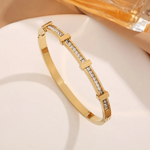 Dette elegante manchetarmbånd er designet til den moderne kvinde, der ønsker et stilrent og eksklusivt smykke med et sofistikeret udtryk. Armbåndet kombinerer en slank, minimalistisk form med funklende krystaldetaljer, der diskret fanger lyset og skaber et luksuriøst look. Det åbne manchet-design gør det nemt at tage armbåndet af og på, samtidig med at det sidder smukt og komfortabelt om håndleddet.