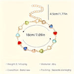 Dette farverige hjertearmbånd er skabt til dig, der elsker smykker med personlighed og et strejf af romantik. Armbåndet kombinerer fine guldfarvede led med små, funklende krystaller formet som hjerter i forskellige livlige farver. Resultatet er et feminint og legende design, der samtidig udstråler elegance og stil.