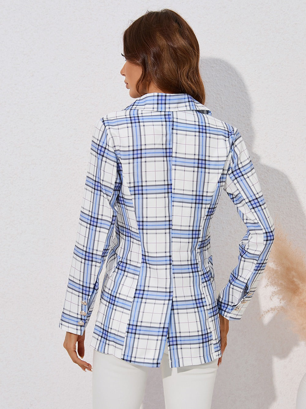 Denne dobbeltradede dame blazer er et tidløst valg for kvinder, der ønsker en jakke, der kombinerer klassisk elegance med moderne detaljer. Det stribede mønster tilfører et frisk og iøjnefaldende udtryk, mens de dekorative dobbeltradede knapper understreger blazeren som et sofistikeret modeitem.