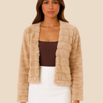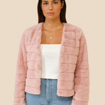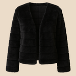 Det enkle, åbne design gør jakken let at style over alt fra stramme toppe og kjoler til strik og jeans. Den lette konstruktion gør den behagelig at bære, uden at den føles tung eller for varm, og den diskrete quilting på indersiden giver ekstra komfort. Faux fur strukturen giver jakken et smukt, jævnt fald, som fremhæver dens eksklusive look.