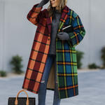 Denne lange ternede damefrakke kombinerer retrocharme med moderne elegance. Frakken er fremstillet i et varmt og blødt materiale med uldlook, som giver både komfort og stil i de kolde måneder. Det iøjnefaldende ternmønster i flotte farvekombinationer gør frakken til et statement-piece, der straks løfter ethvert outfit.