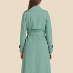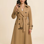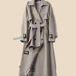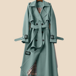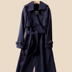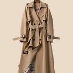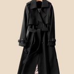 Denne lange trenchcoat til kvinder kombinerer tidløst design med moderne elegance, hvilket gør den til et uundværligt overtøj i enhver garderobe. Med sin klassiske dobbeltradede lukning, justerbare ærmestropper og matchende taljebælte, skaber den en feminin og velproportioneret silhuet. Den lange længde giver ekstra varme og et eksklusivt udtryk, som gør frakken ideel til både hverdagsbrug og mere formelle anledninger.