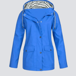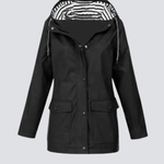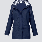 Denne moderne regnjakke til damer kombinerer funktion og stil på den bedst mulige måde. Jakken er fremstillet i et let, men slidstærkt vandtæt materiale, der effektivt beskytter mod regn, vind og fugt – perfekt til både byliv, gåture og udendørsaktiviteter. Den praktiske hætte med snøre sikrer ekstra dækning på våde dage, mens det stribede inderfor tilføjer et stilfuldt maritimt touch.