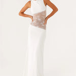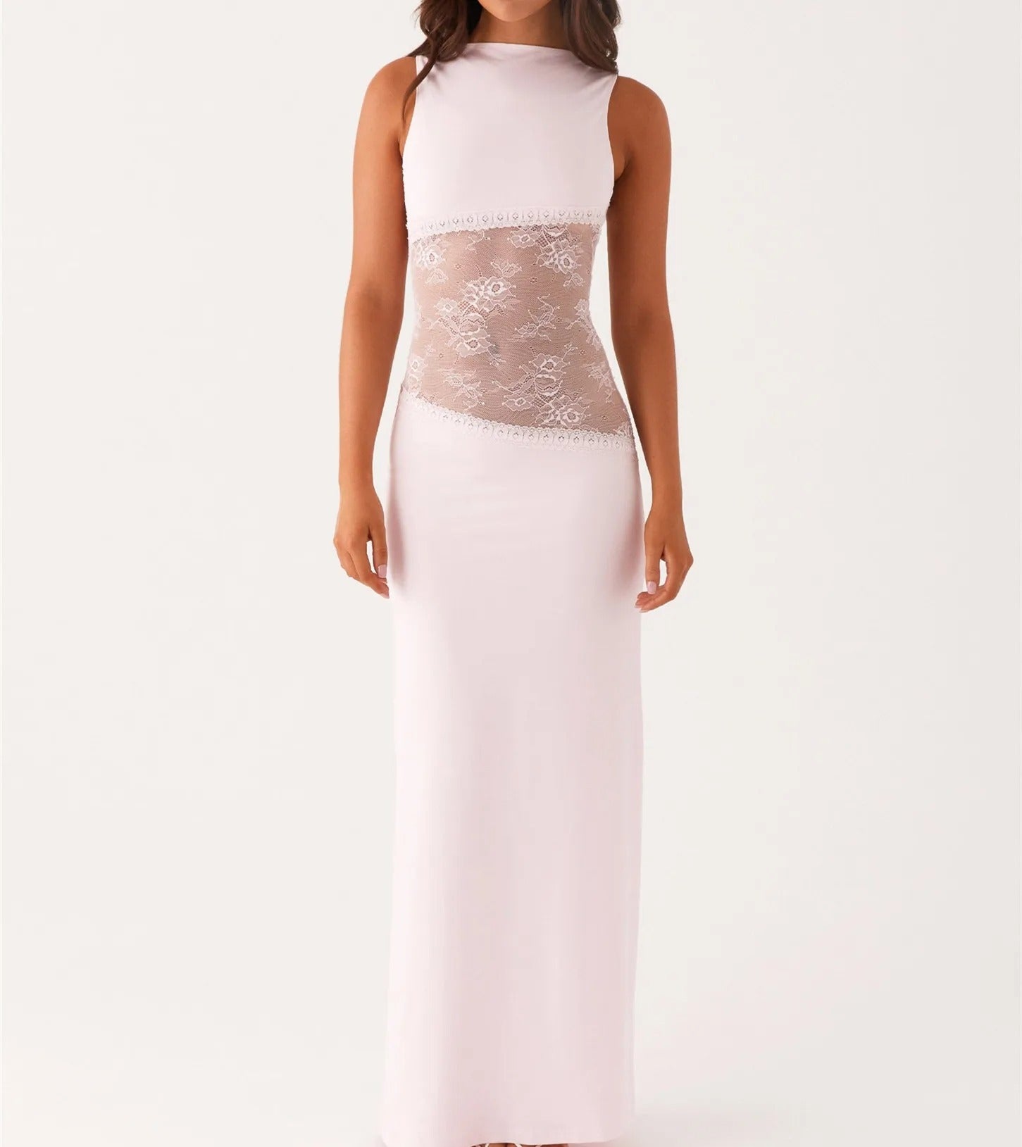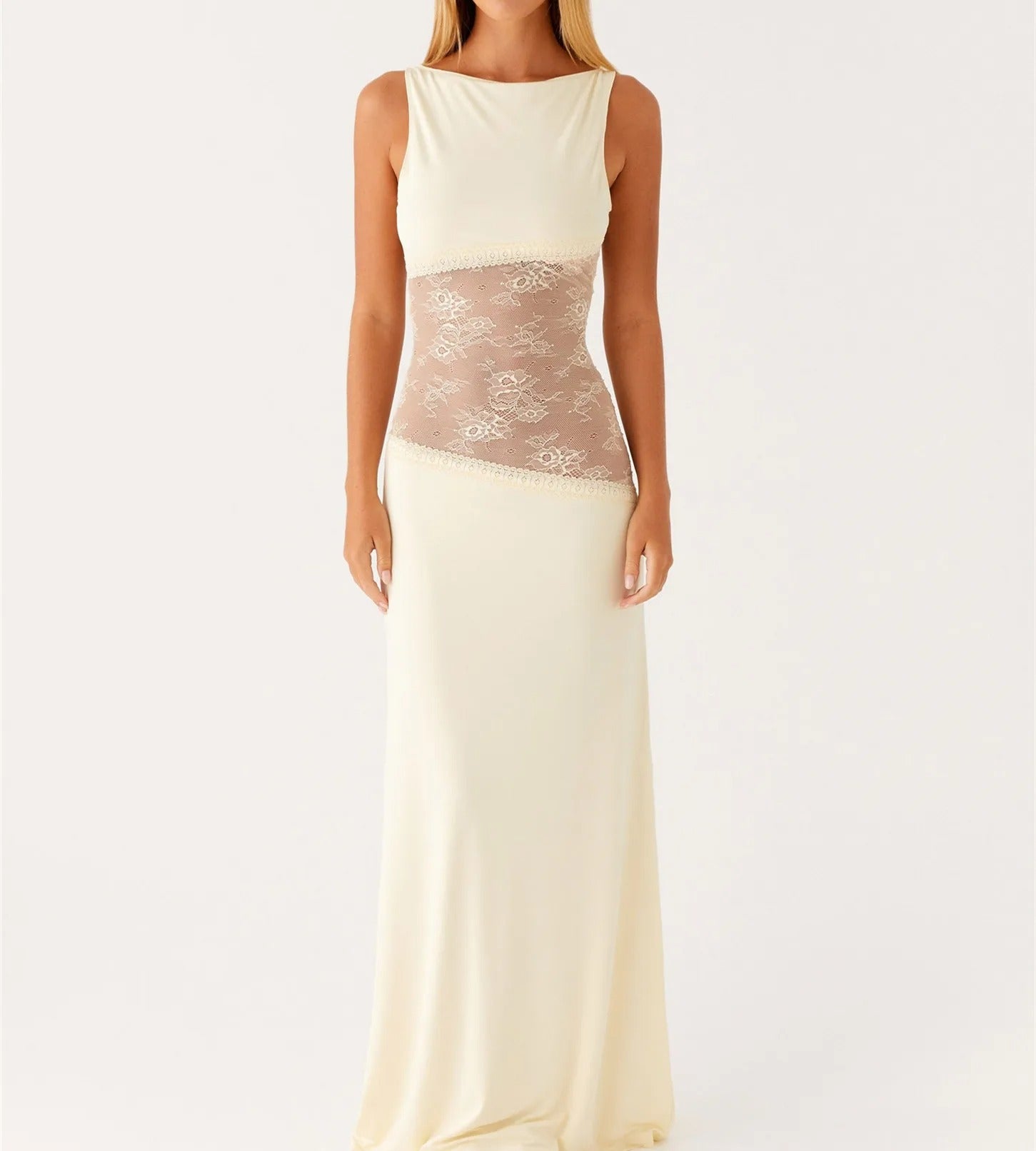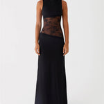Denne lang kjole med blonder er definitionen på tidløs elegance med et moderne twist. Kjolen har en glat, figursyet pasform, der smyger sig om kroppen og fremhæver din naturlige silhuet. Det gennemsigtige blondepanel i taljen tilføjer både sensualitet og finesse, samtidig med at det skaber en flatterende timeglas-effekt.