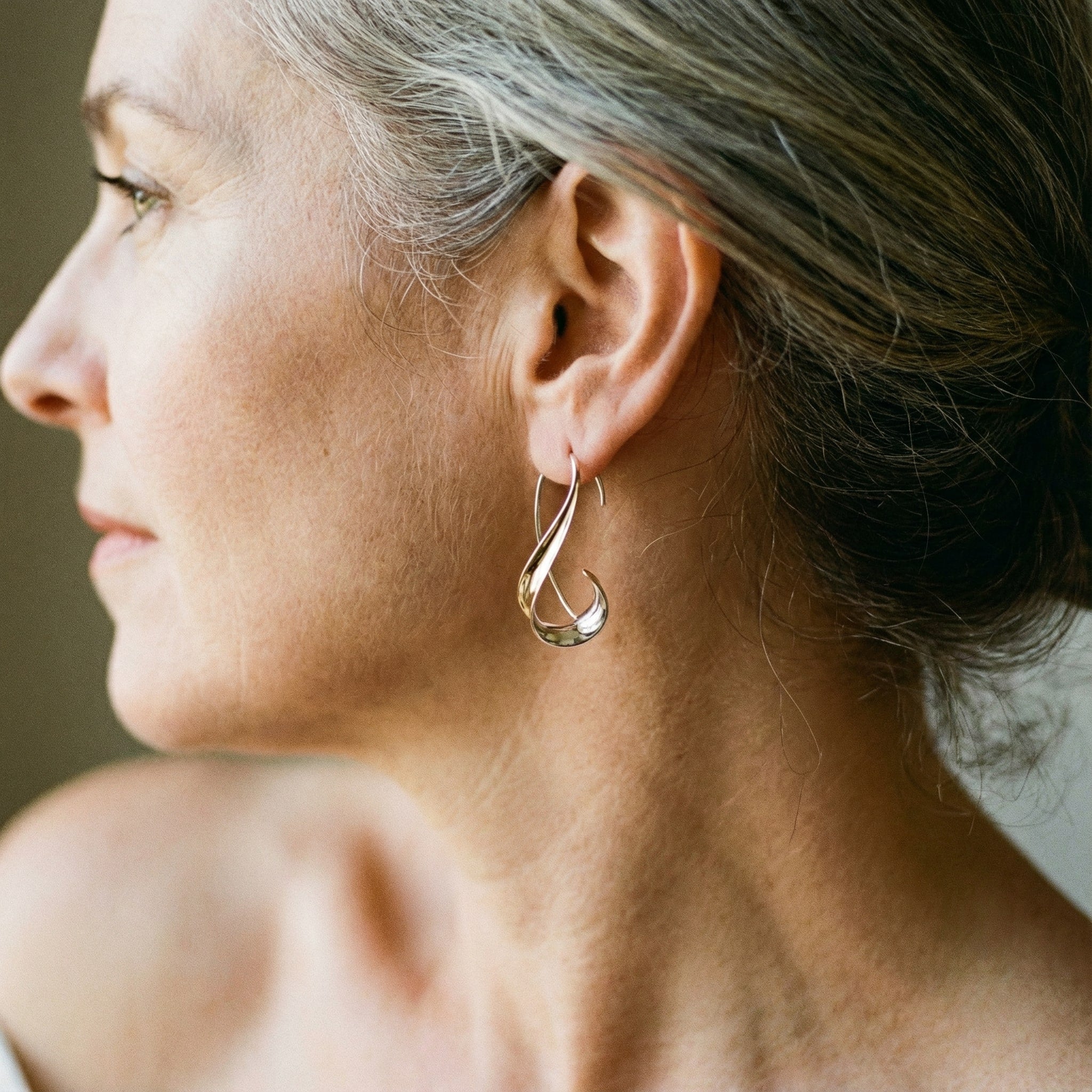 Disse moderne sølv og guld øreringe med elegant bølgedesign er skabt til dig, der ønsker et stilfuldt og kunstnerisk smykke med et unikt udtryk. Designet kombinerer to smukt buede former i sølv- og guldfarvet finish, som tilsammen skaber en dynamisk og flydende silhuet. De bløde linjer giver et sofistikeret look, der elegant følger ansigtets konturer og tilfører et eksklusivt touch til enhver stil.
